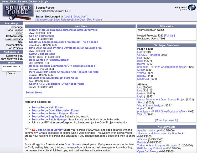 SourceForge.netはVA Linux社で生まれたサイトだが、すぐに子会社である米国OSDN社へ譲渡されている。で、当時のSourceForgeはそのOSDN社の中心的サイト… ではなかった。開始当時は流石にSlashdotのほうが規模は大きいし、Freshmeat、Themes.org、NewsForge.comなどの当時の定番サイトの他、ThinkGeek.com、AnimationFactoryなどのEコマースサイトもあった。他にももう少しライトなテクノロジー分野をカバーするWebサイトが7,8個存在していた。